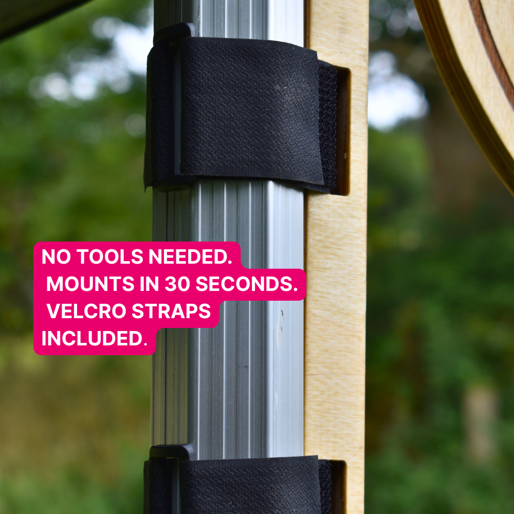It mounts to your gazebo pole with two heavy-duty Velcro straps. No tools. No faffing. No need to explain who you are - your sign does it for you.